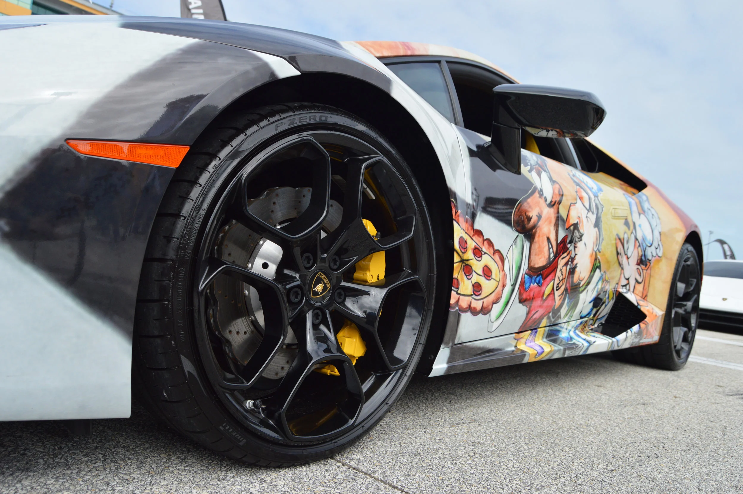 Jonathan Aizenstat designed a digital vinyl wrap for a 2017 Lamborghini Huracán and delivered an immersive experience during the Ride2Revive Charity Track Event, which provides kids with life-threatening illnesses a memorable, adrenaline-filled driving experience to revitalize their senses. The artwork transformed the vehicle (MSRP $242,000) into a "cheese pizza" to which children added vinyl toppings. Commissioned by the Prestige Imports & Lamborghini to raise awareness for terminal illnesses.